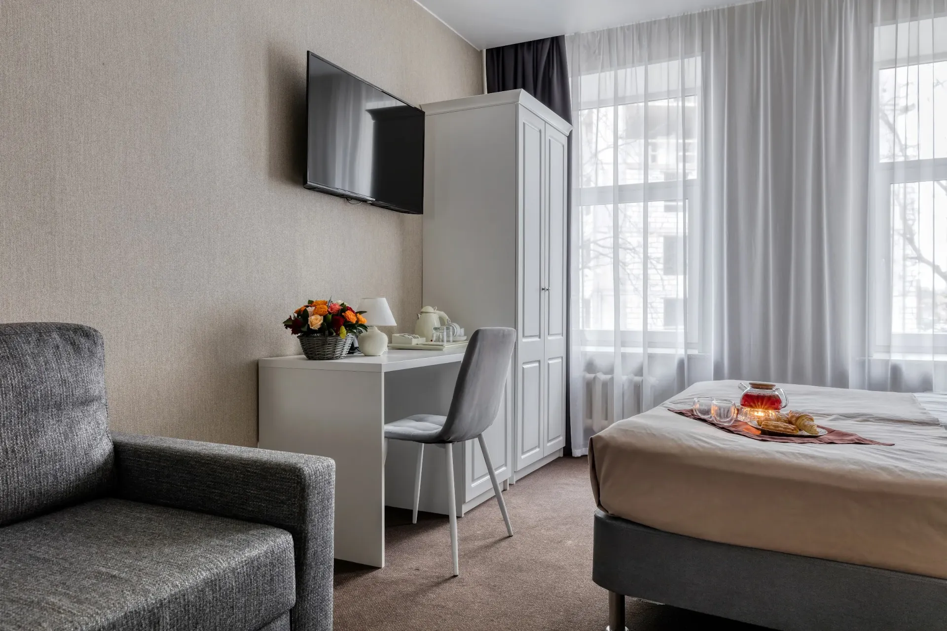 Просторный номер площадью 18–22 кв.м. подойдёт для размещения одного или двух гостей, а также для проживания с дополнительным местом (дополнительное место предоставляется по запросу). В зависимости от планировки в номере установлена двуспальная кровать или две односпальные кровати размером 90×200 см. В качестве дополнительного спального места предусмотрен диван 140×200 см или кресло-кровать. В номере собственная ванная комната с душем, феном и туалетными принадлежностями, а также телевизор, мини-холодильник, телефон, сейф и бесплатный высокоскоростной Wi-Fi. Окна выходят на тихий внутренний двор или улицу. Все номера отеля для некурящих.